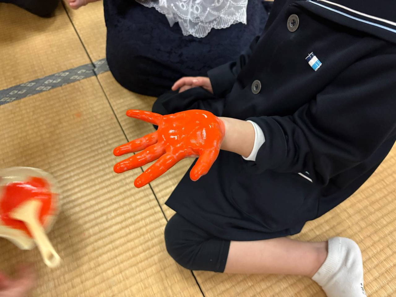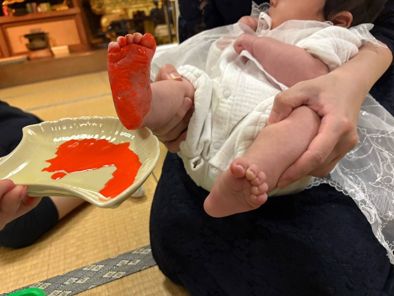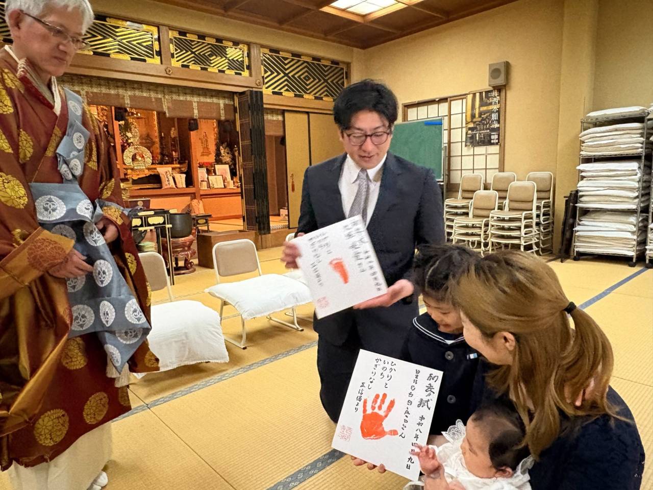 初参式おつとめしました 2026/04/10 初参式おつとめしました 令和8年4月9日 お隣、西区でカフェを営むご家族。 5歳になったお姉ちゃんともうすぐ3か月になる妹さんが初参式を受式いたしました。 小さい赤ちゃんはまだ手が開きにくいので足形を取ります。 おとなしくしてくれていました。 お姉ちゃんは手形。 こちらもさすが。衣装を汚すことなく落ち着いています。 手形足形ともに色紙にキレイに取れました。 前門主のご消息にあるように、ほとけの子の誕生は家族の方々の尊い仏縁です。この小さないのちがすこやかに育つよう、お念仏・仏法薫る環境をわれわれ大人が作っていくことが大切です。 仏教・浄土真宗 お祝い