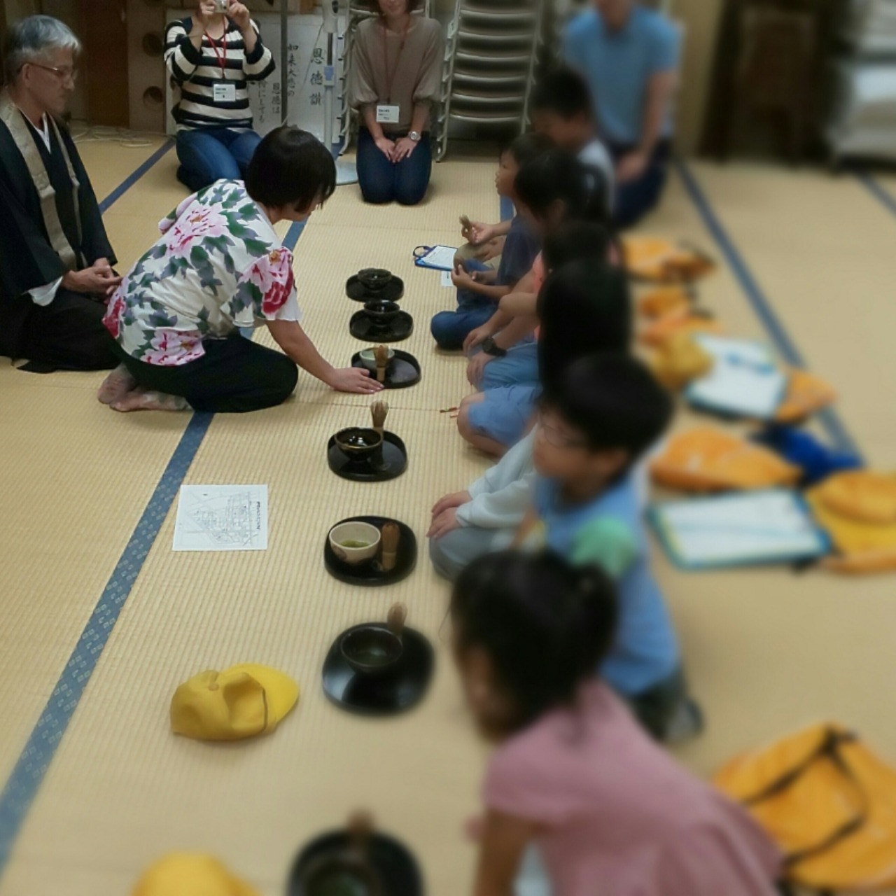 西明寺の歴史から扇風機の数まで質問したあと、お抹茶体験。茶せんを使って初めて点てます。うまく泡立てるのは大人でも難しいのですが、なかには上手に点てる子もいます。