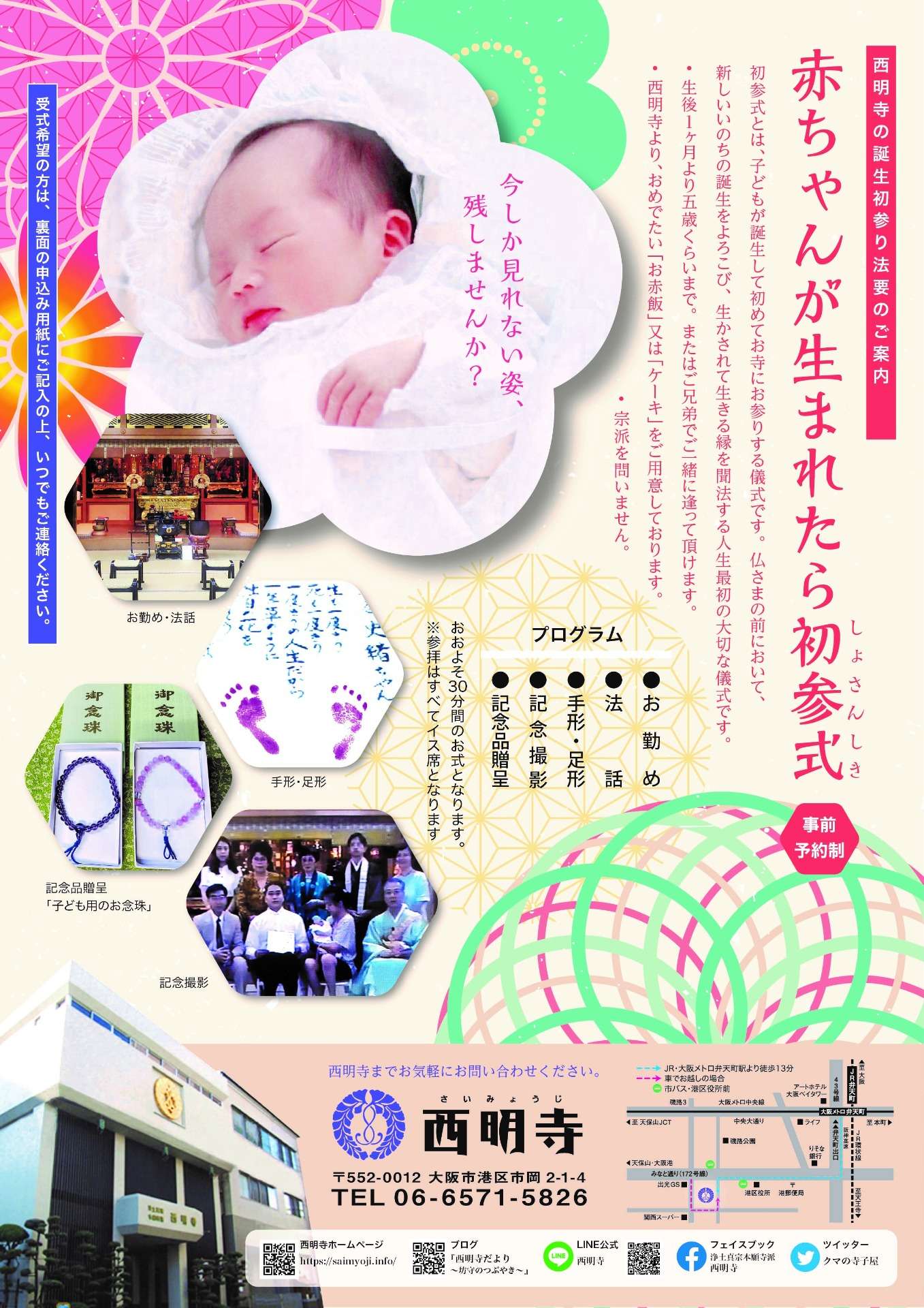 お勤め、住職法話のあと、手形もしくは足形を色紙に取り、記念撮影。子ども念珠の進呈、お赤飯かケーキのプレゼントもございます。式は30分ほどで、いす席で行います。