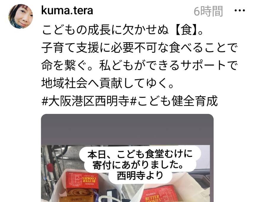 Threads 子ども食堂 2023/10/11 Treads 子ども食堂 インスタグラムをベースとしたSNS「Threads」でも西明寺の活動を紹介しております。 今回は地元・市岡の子ども食堂におやつを寄付しましたことを上げております。 地域、学校 応援