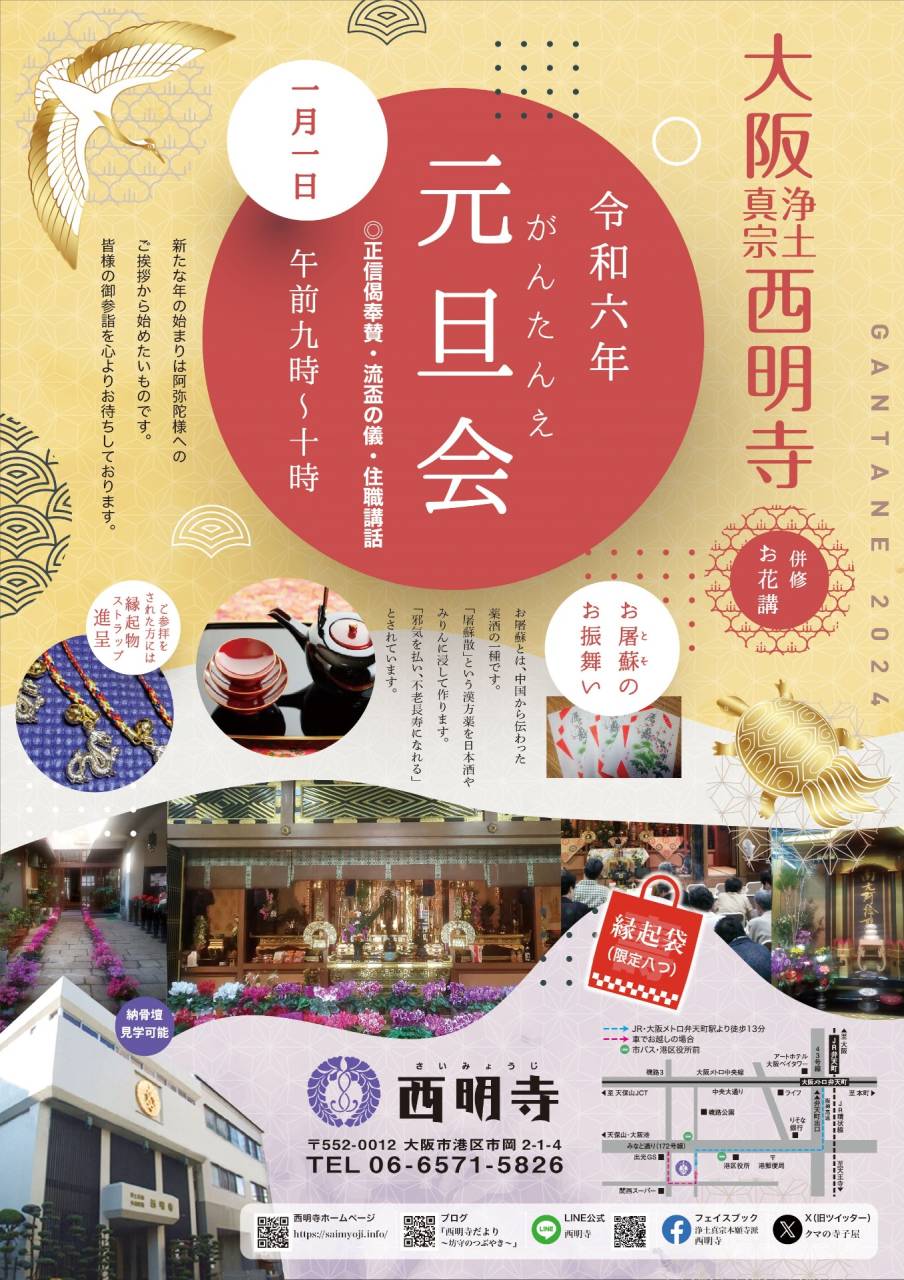 2024年元旦会 2023/12/03 2024年元旦会 来年2024年元旦会は1月1日午前9時よりお勤めいたします。 正信偈奉賛、住職講話、流盃の儀、抽選会。 縁起物干支ストラッププレゼント。 どなた様でもお参り出来ます。一年の始まりは阿弥陀様へのご挨拶から。 納骨・参拝 仏教・浄土真宗