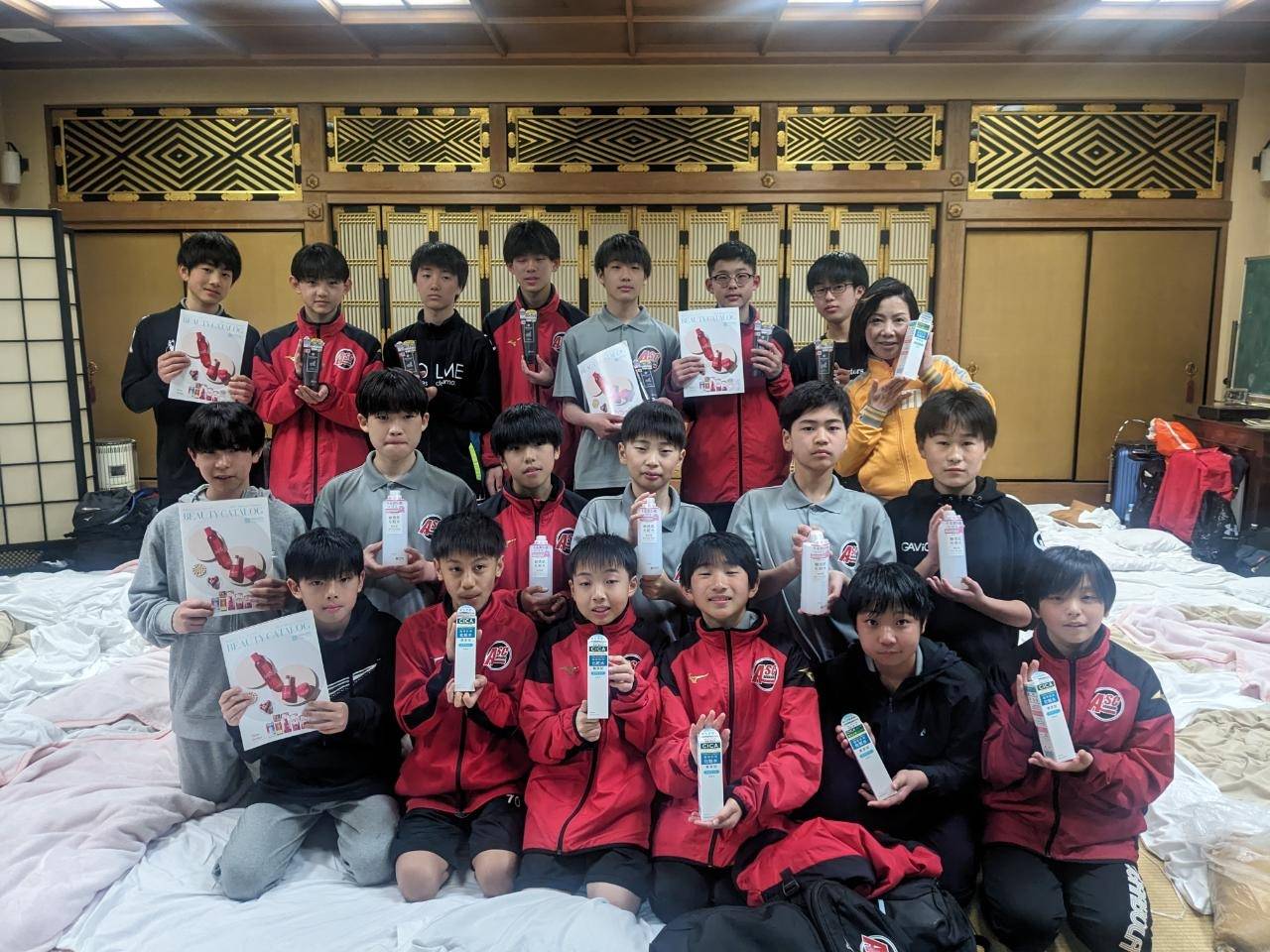 合宿一日目 2024/03/28 合宿一日目 北海道より本日飛行機で来阪、バスで舞洲に移動し練習試合をした後、直接お寺近くの老舗食堂で夕食。 徒歩でお寺にやってきました。コインランドリーで洗濯、銭湯で入浴、スーパーで買い物と大忙し。 でもみんな、元気で楽しそうにしていて安心しました。 以前お寺近くに本社のあった桃谷順天館さんよりスキンケア商品をご提供いただきました。 いまのうちから手入れすれば将来もお肌ツルツル間違いなし。 応援